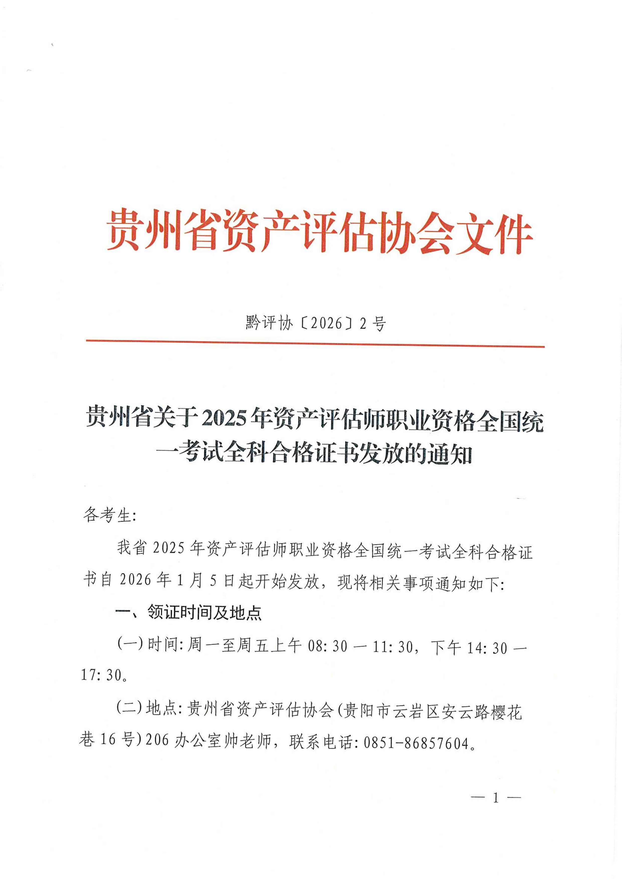 贵州省关于2025年资产评估师职业资格全国统一考试全科合格证书发放的通知
