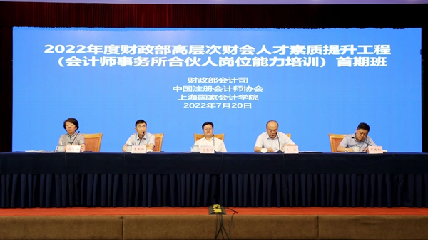 7月20日上午,财政部高层次财会人才素质提升工程(会计师事务所合伙人岗位能力培训)首期管理合伙人培训班在江苏镇江开班。中国注册会计师协会党委书记、秘书长舒惠好,江苏省财政厅一级巡视员李载林,财政部会计司副司长王东,上海国家会计学院副院长白晓红出席并讲话,中国注册会计师协会党委委员、副秘书长万文翔主持开班式。77家会计师事务所111名管理合伙人参加开班式。