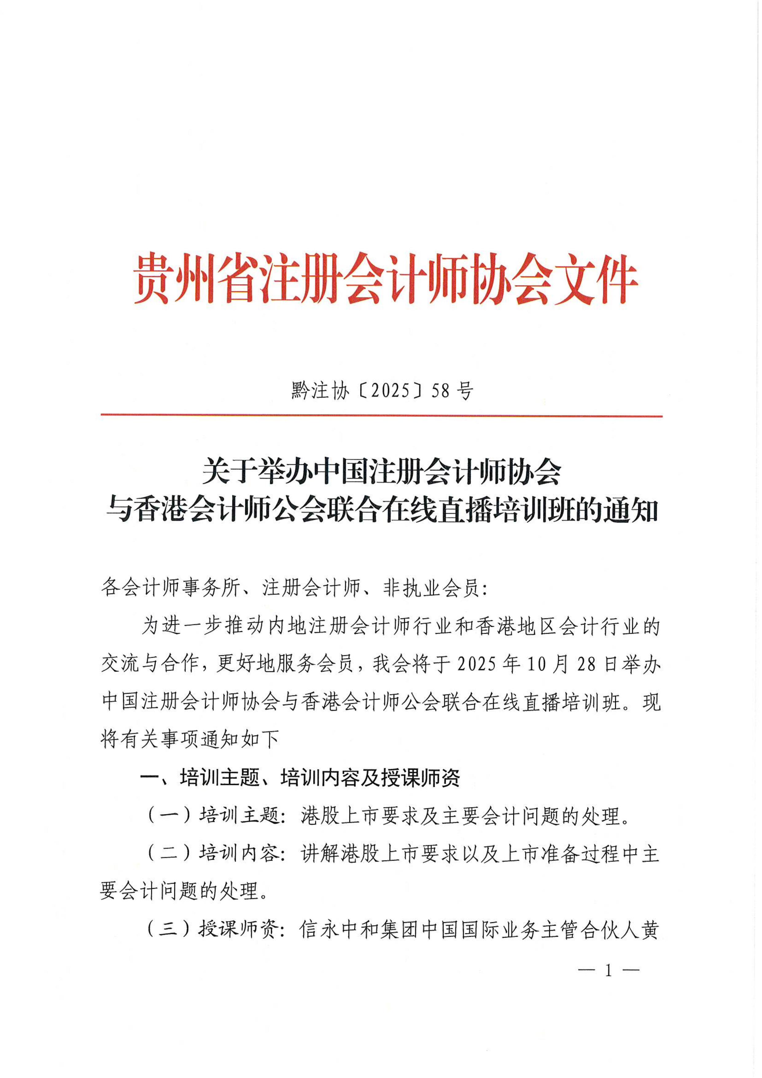 关于举办中国注册会计师协会与香港会计师公会联合在线直播培训班的通知