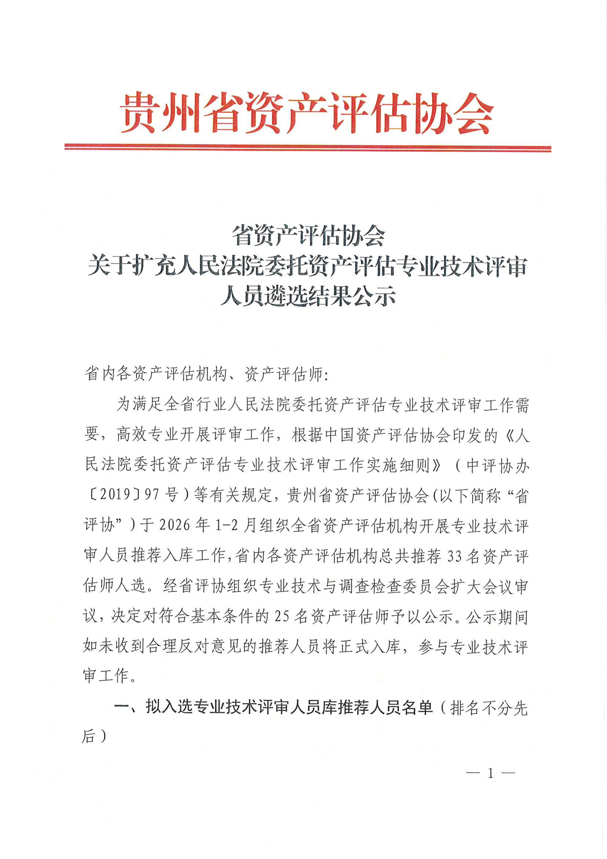 省资产评估协会关于扩充人民法院委托资产评估专业技术评审人员遴选结果公示